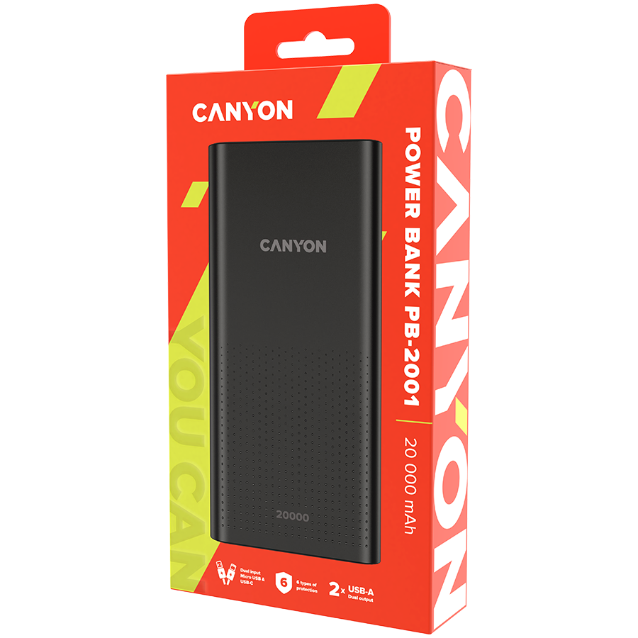 Every gadget user has faced this problem when a smartphone or headphones battery runs out amidst the most interesting place of a series, a game, or a heated chat discussion! Canyon released the PB-2001 power bank model to help you use a mobile device all day long without worrying about a dead battery. It is notable for its high capacity and fairly compact housing with 2 charging inputs – Micro-USB and Type-C. The battery can charge 2 devices simultaneously via USB-A outputs. In addition, the power bank has six types of protection and is dressed in stylish dark graphite or white case. PB-2001 takes up the least possible amount of space in your bag while performing at maximum!