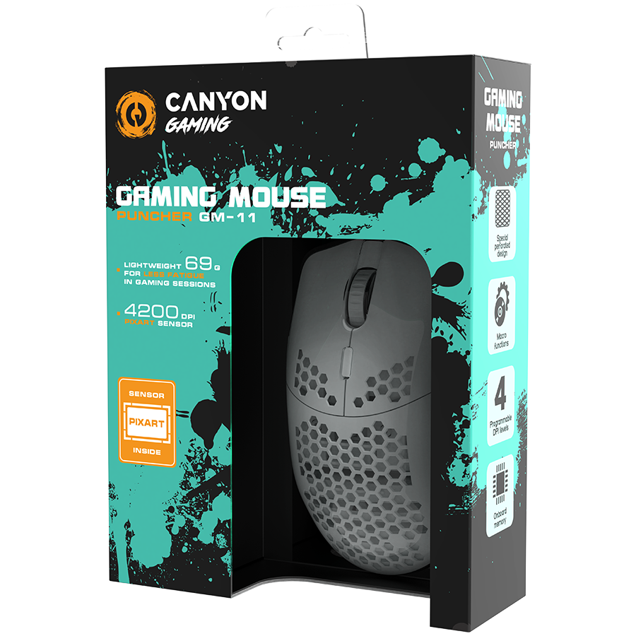 CANYON Puncher GM-11, Gaming Mouse with 7 programmable buttons, Pixart 3519 optical sensor, 4 levels of DPI and up to 4200, 5 million times key life, 1.65m Ultraweave cable, UPE feet and colorful RGB lights, White, size:128.5x67x37.5mm, 105g