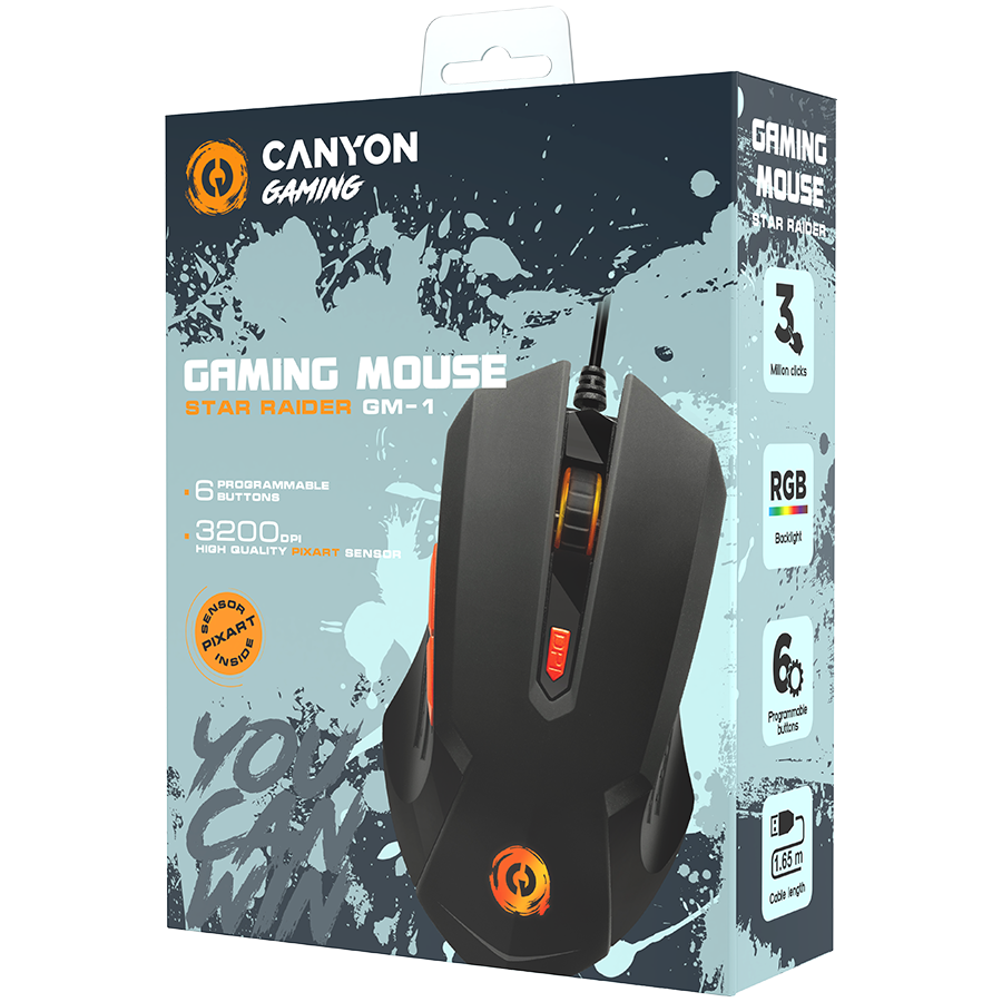 CANYON Star Raider GM-1, Optical Gaming Mouse with 6 programmable buttons, Pixart optical sensor, 4 levels of DPI and up to 3200, 3 million times key life, 1.65m PVC USB cable,rubber coating surface and colorful RGB lights, size:125*75*38mm, 115g