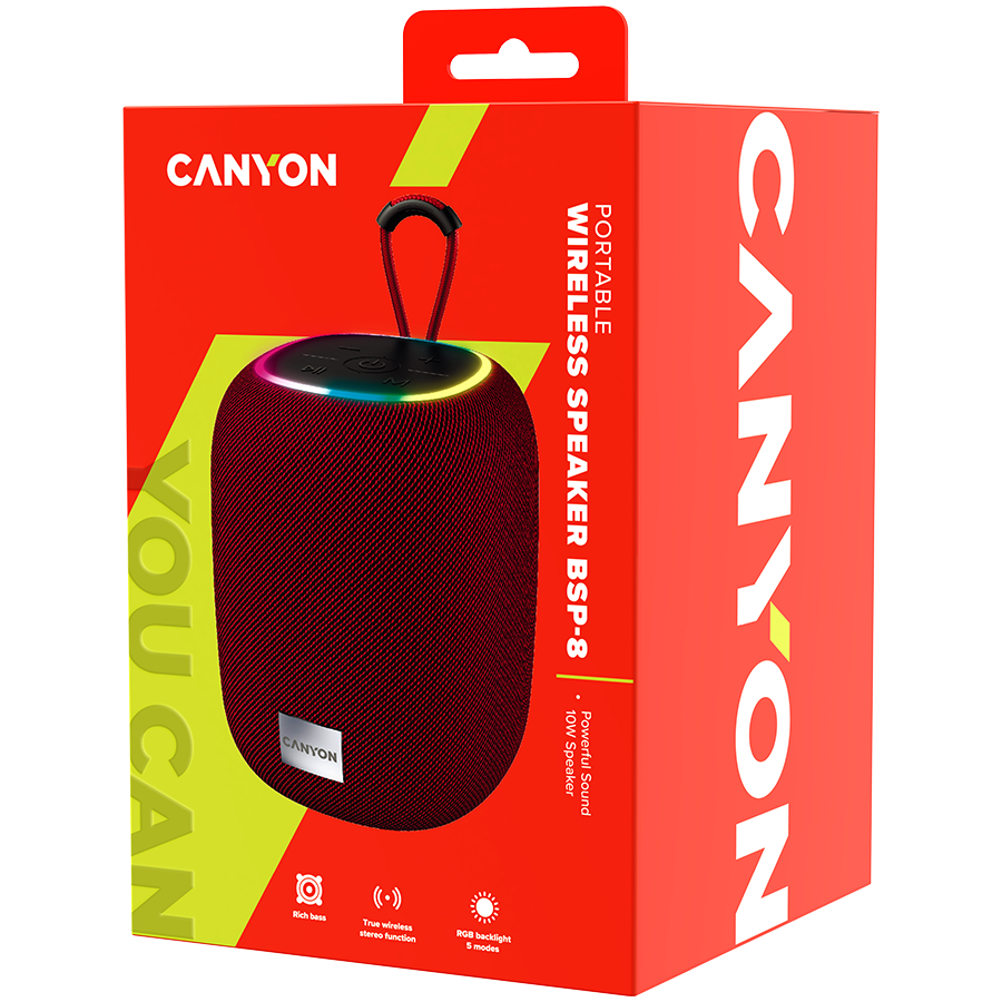 CANYON BSP-8, Bluetooth Speaker, BT V5.2, BLUETRUM AB5362B, TF card support, Type-C USB port, 1800mAh polymer battery, Max Power 10W, Red, cable length 0.50m, 110*110*135mm, 0.57kg